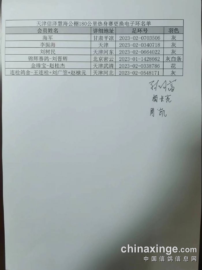 天津信泽慧海公棚180公里热身赛更换电子环名单