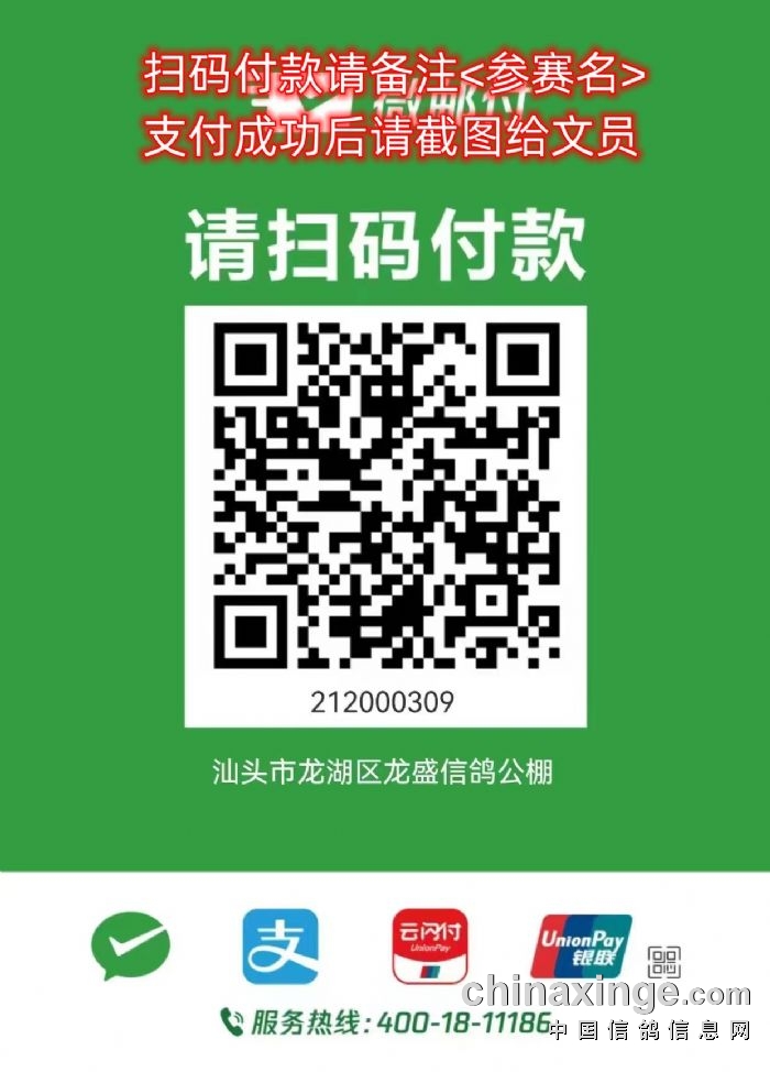 请扫描以下二维码,填写支付金额,并在“备注”里填写清楚鸽主参赛名。付款成功后截图发给文员微信,并说明指定环号、指定组别等内容。
