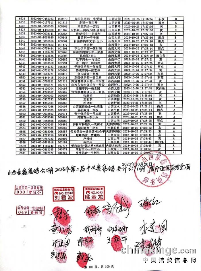 2023年第二届山西泰鑫赛鸽公棚半决赛执行裁判及鸽友代表签字确认