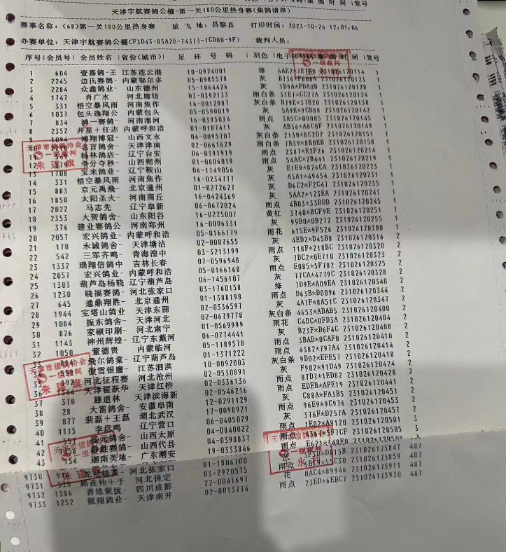 天津宇航VIP赛鸽公棚180公里热身赛(集鸽清单)