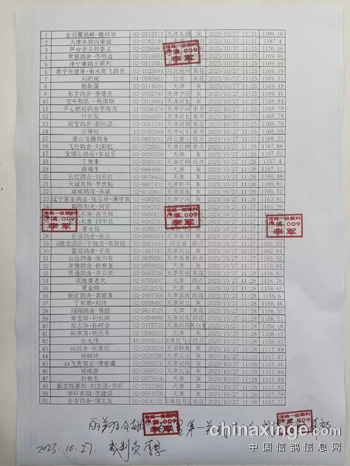 天津丽翔赛鸽公棚300公里前50名获奖名单