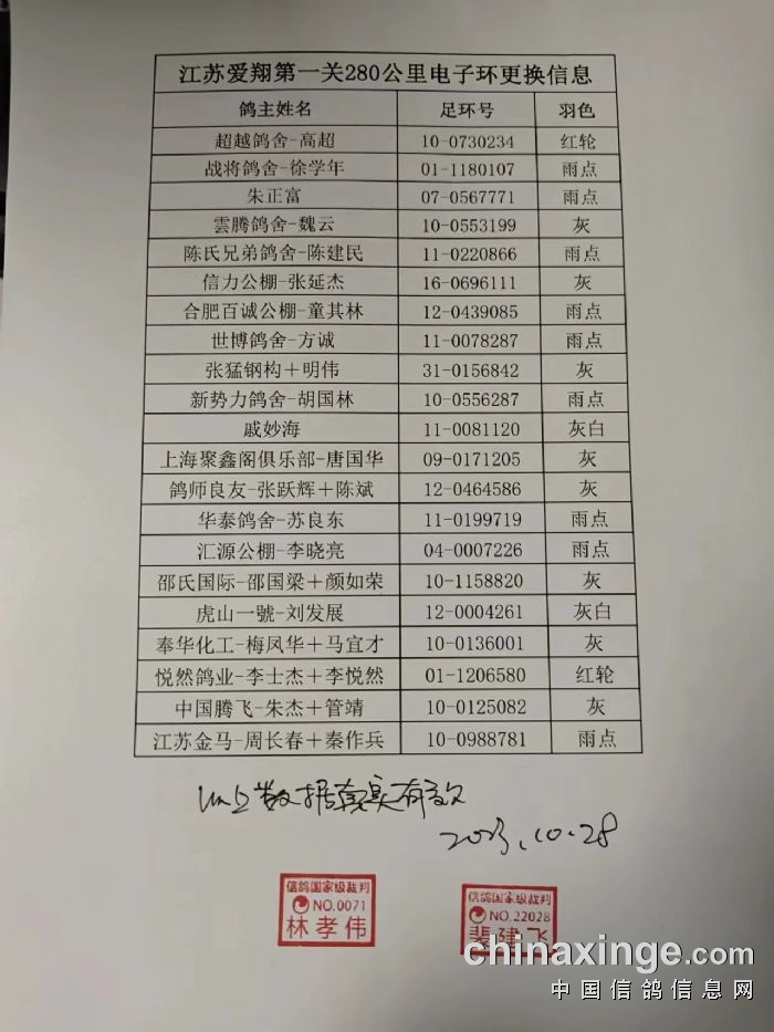 江苏爱翔(秋棚):近期迟归鸽名单