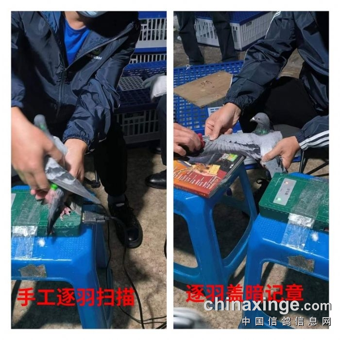 第一羽扫描上笼环号:2023-22-1086044在裁判组的监督指导下,多机位进行现场直播,全程集鸽工作有条不絮的进行。