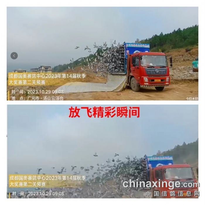 2023年10月29日上午09:08分在广元开笼。经度/纬 东经 105°51′51.0000″北纬 32°28′40.0000″随着裁判员的一声令下,鸽车开笼,4172羽赛鸽有序出笼。
