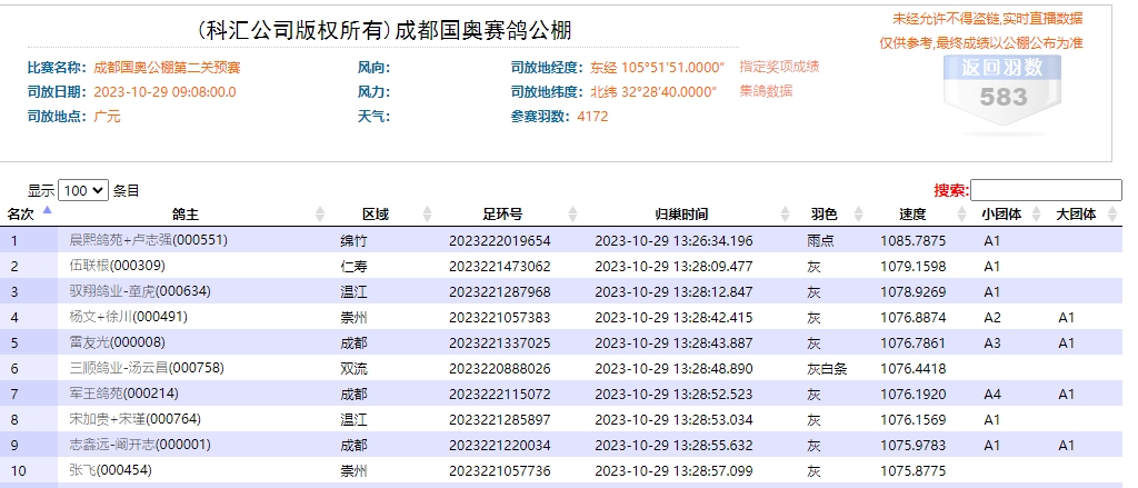 截止发稿前,归巢583羽,归巢率约13.9%。关注更多精彩赛事扫码关注信-鸽-天-堂!