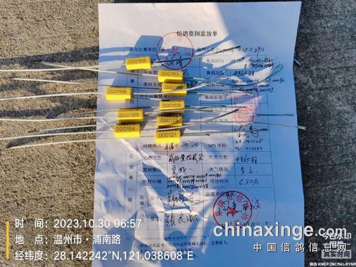 福建鼎诚赛鸽公棚【小棚】2023年第一关280KM(乐清站)热身赛已于10月30日上午6点50分开笼,司放地浙江乐清,司放地经纬度:经度 121度,2分,34.31秒 , 纬度 28度,8分,20.66秒 ,司放地天气晴,赛鸽走势良好,预祝广大鸽友取得好成绩!