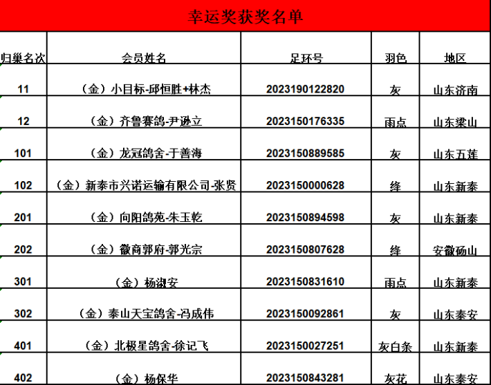 山东翔程赛鸽公棚首届决赛幸运奖获奖名单