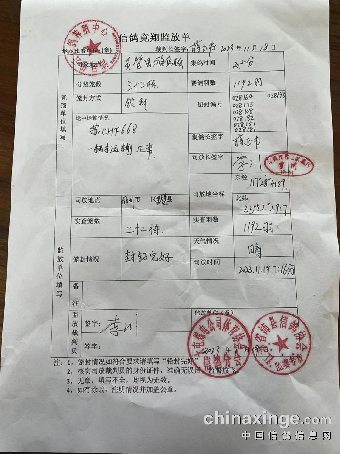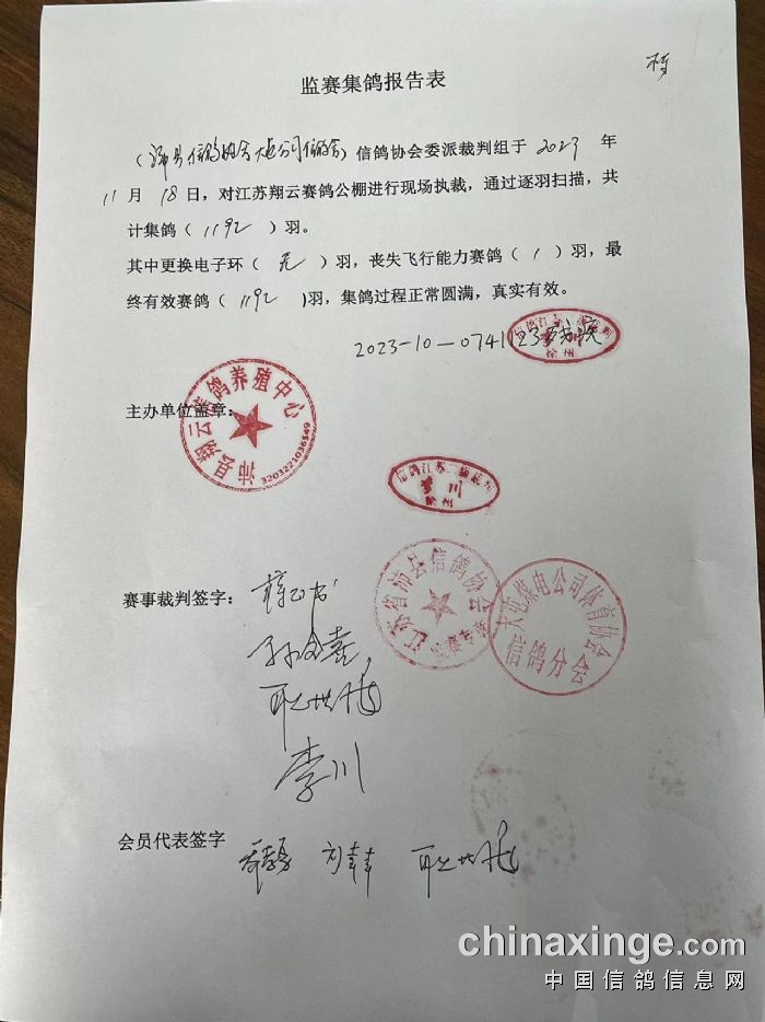 沛县翔云赛鸽公棚监赛集鸽报告表