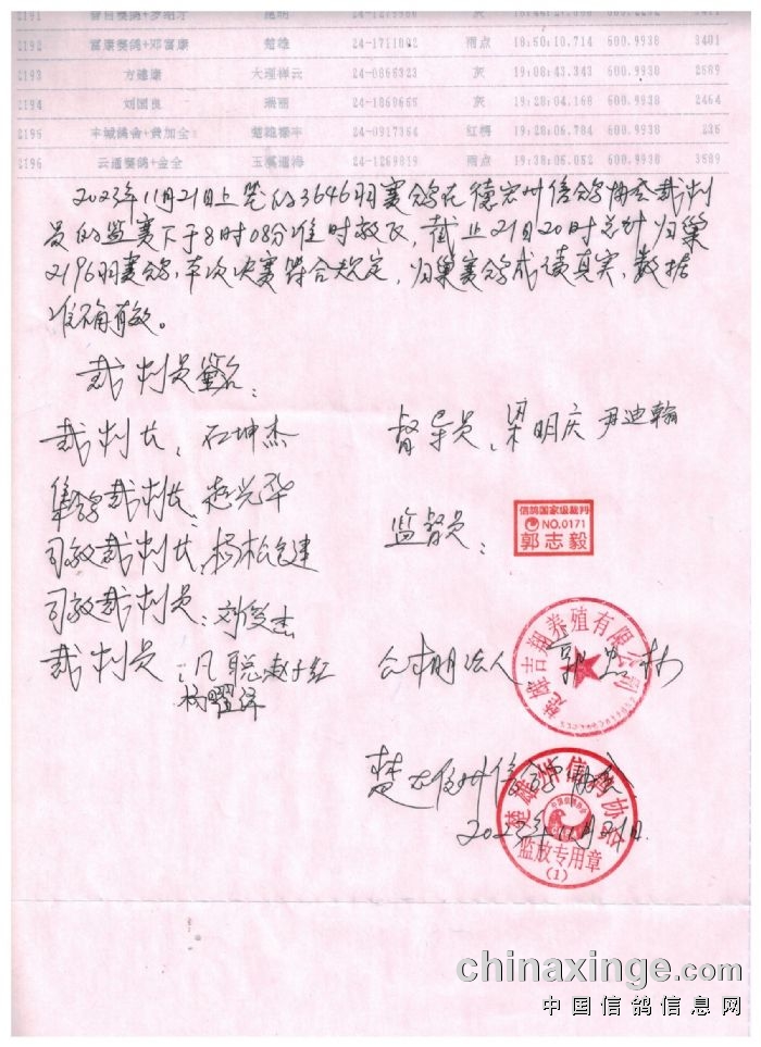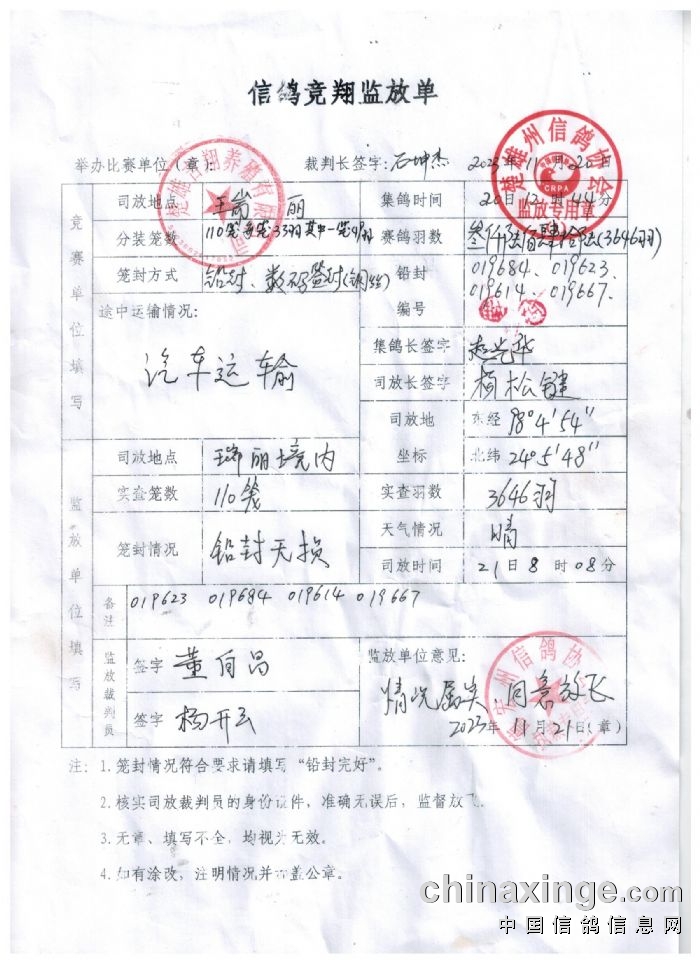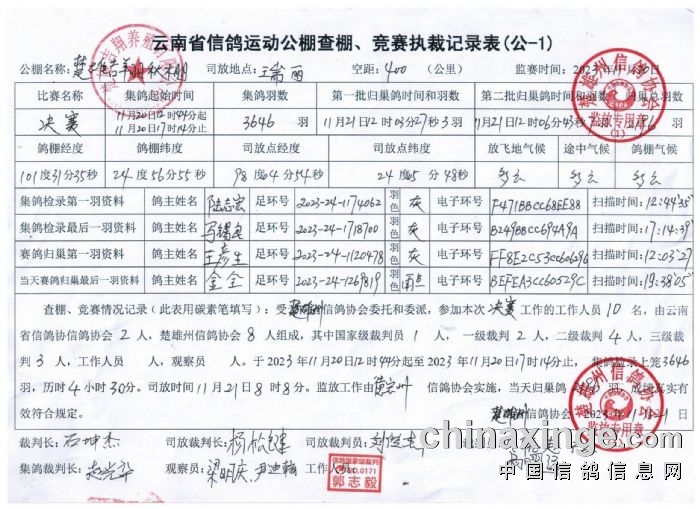 楚雄吉翔秋棚400公里决赛执裁记录表、监放单