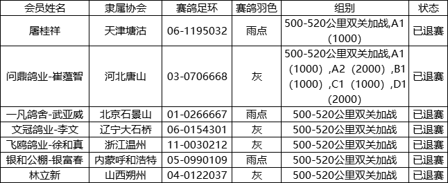 天津宇航VIP赛鸽公棚加站赛未上笼名单