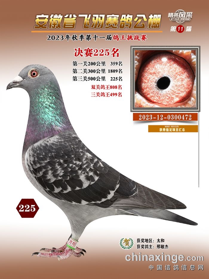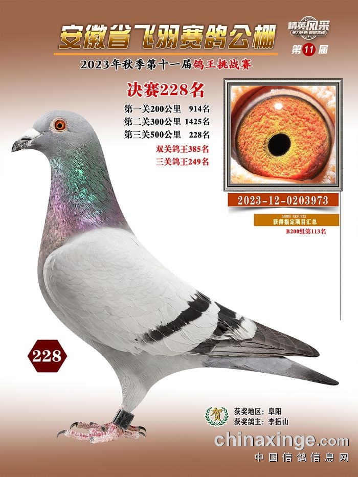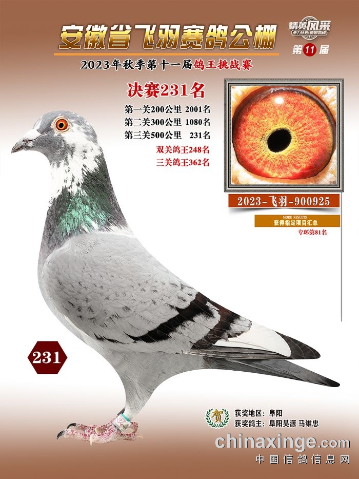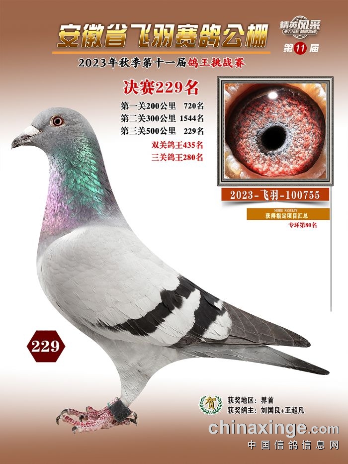 安徽飞羽公棚:2023年获奖鸽图片鉴赏225名-231名