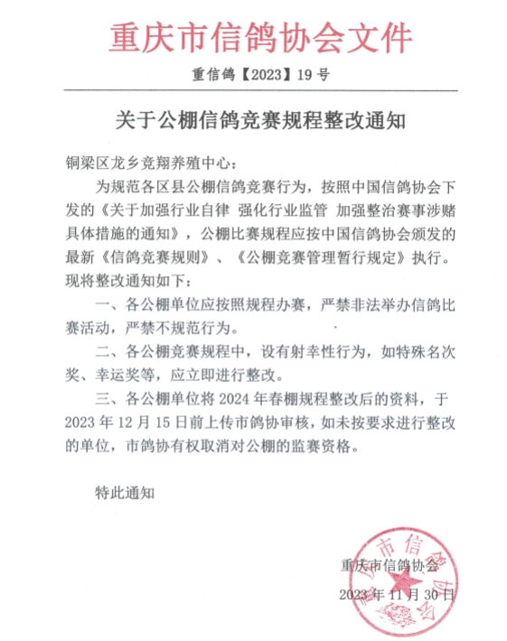 根据重庆市信鸽协会发布的“重信鸽【2023】19号文件(关于公棚信鸽竞赛规程整改通知)”文件具体内容如下:
