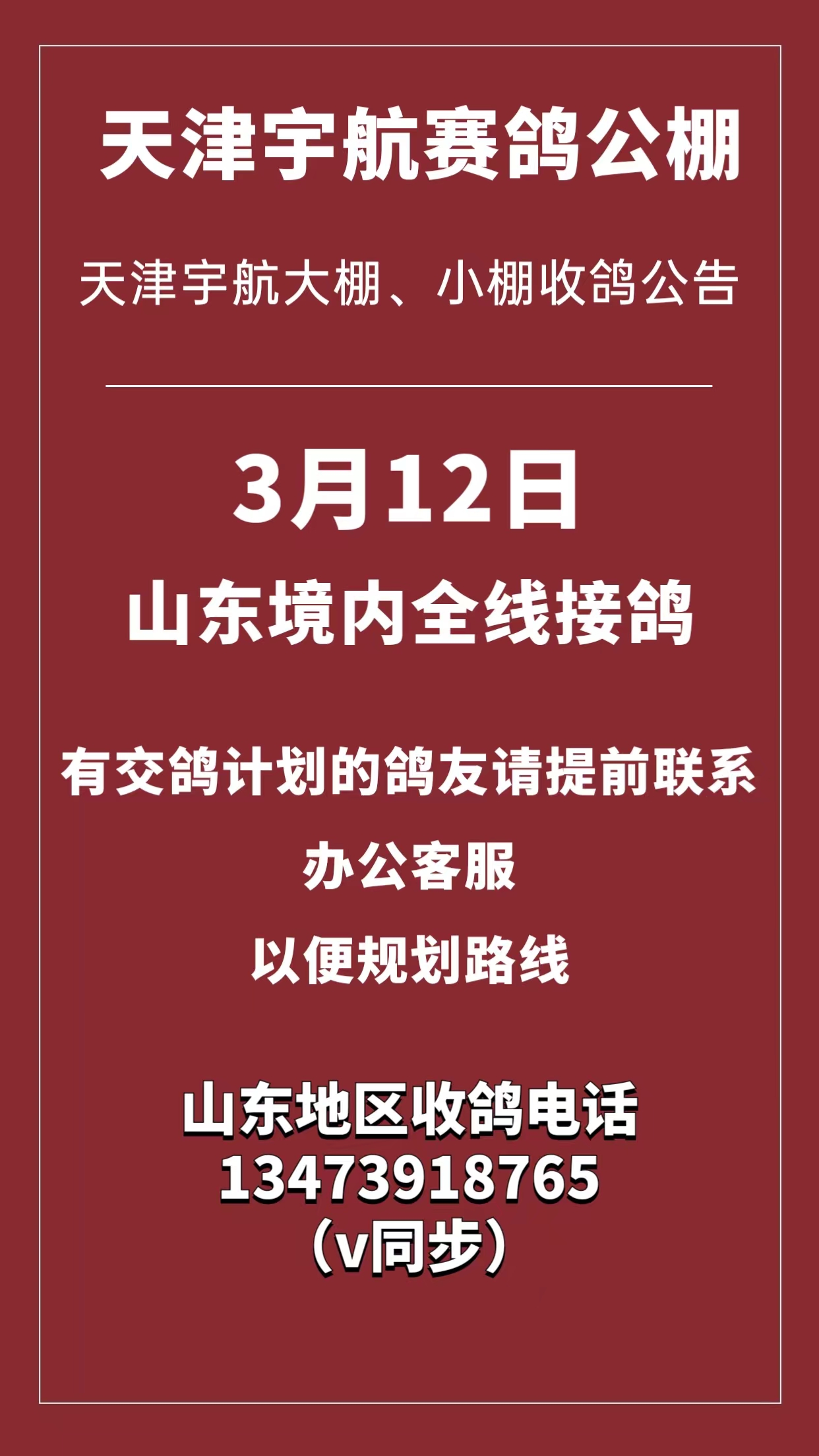 天津宇航赛鸽公棚3月12日前往山东地区全线接鸽