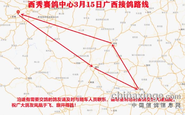 从西秀赛鸽中心出发,途经梧州、柳州、桂林最后返回西秀赛鸽中心。