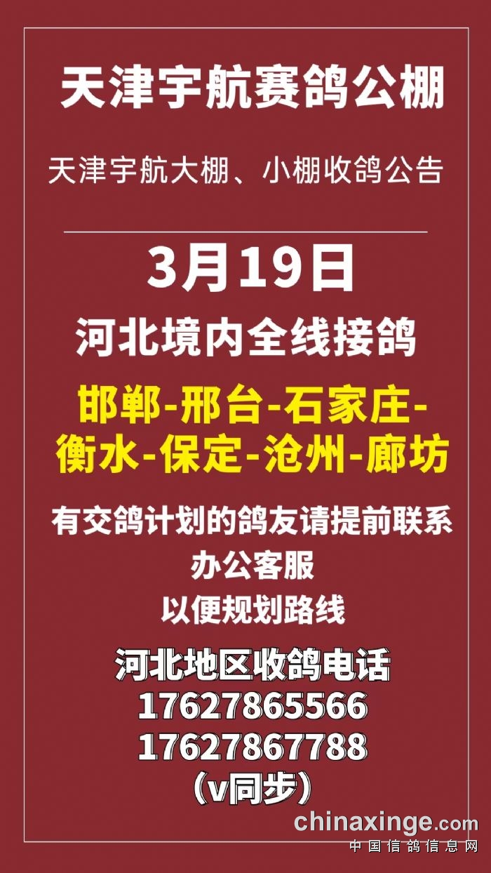 天津宇航赛鸽公棚3月15日前往河北地区全线接鸽