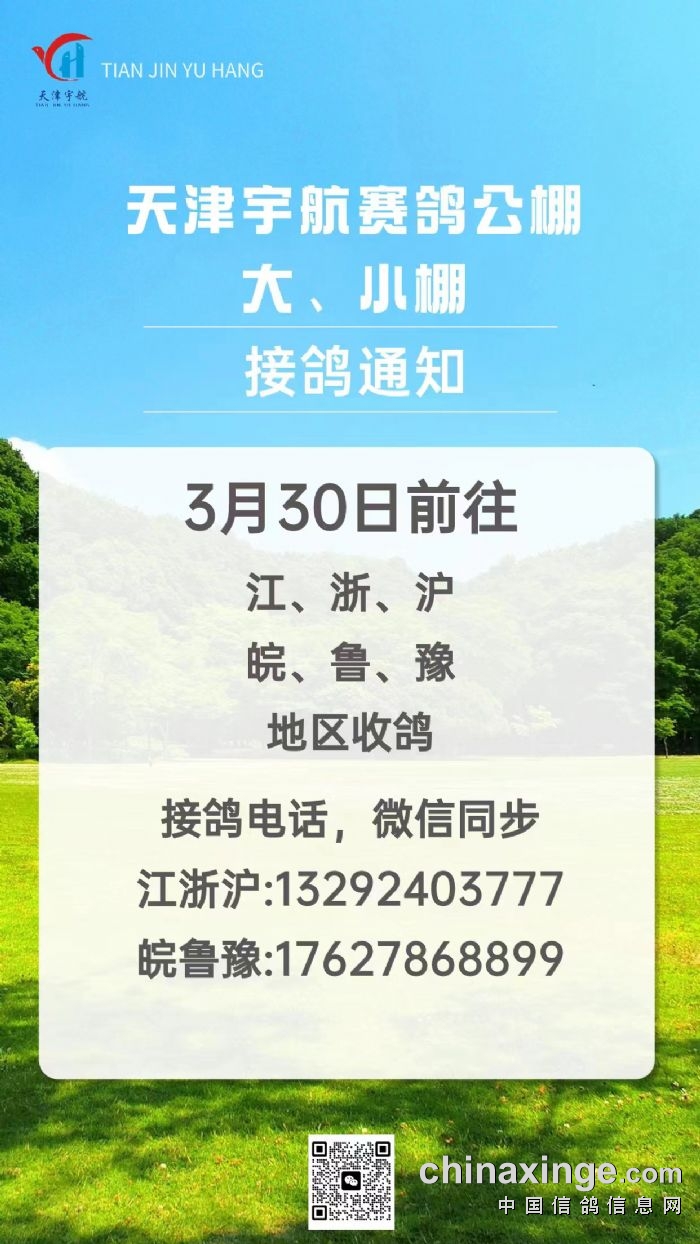 天津宇航赛鸽公棚3月30日前往江、浙、沪、皖、鲁、豫地区接鸽