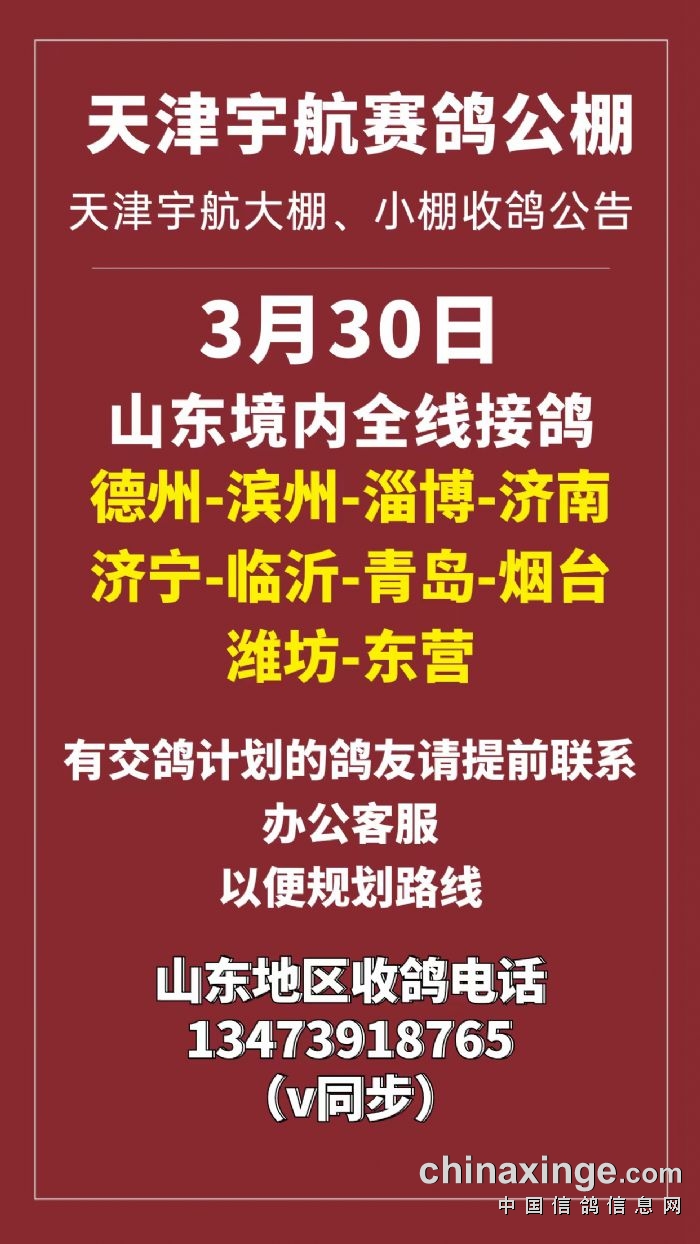 天津宇航赛鸽公棚3月30日前往山东地区全线接鸽