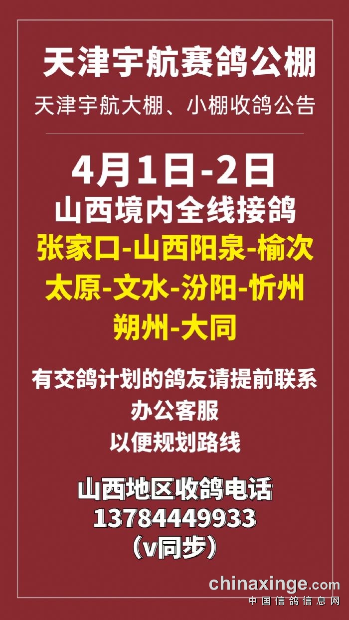 天津宇航赛鸽公棚4月1日-2日前往张家口、山西地区全线接鸽