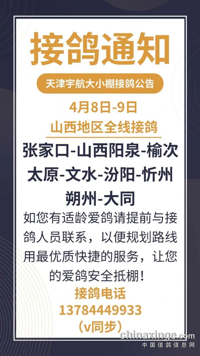 天津宇航赛鸽公棚4月8日-9日前往山西地区全线接鸽
