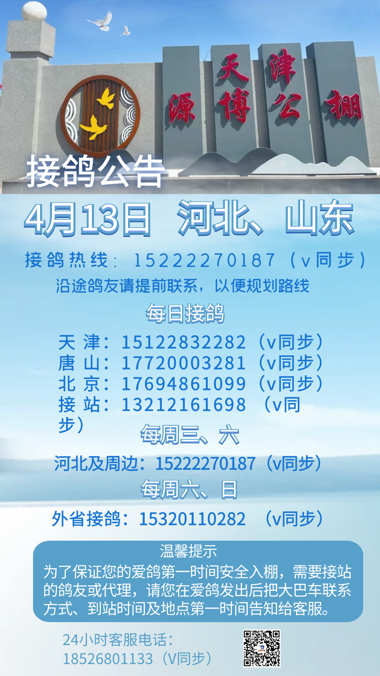 天津源博公棚3月24日河北、山东全境接鸽公告