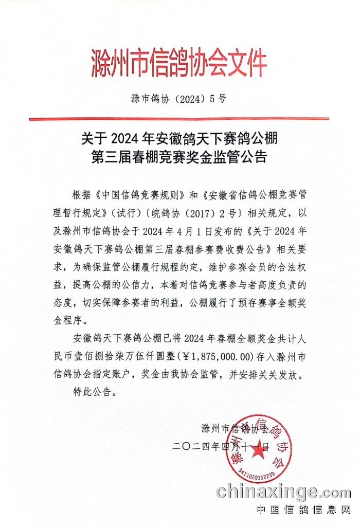 安徽鸽天下赛鸽公棚第三届春棚竞赛奖金监管公告