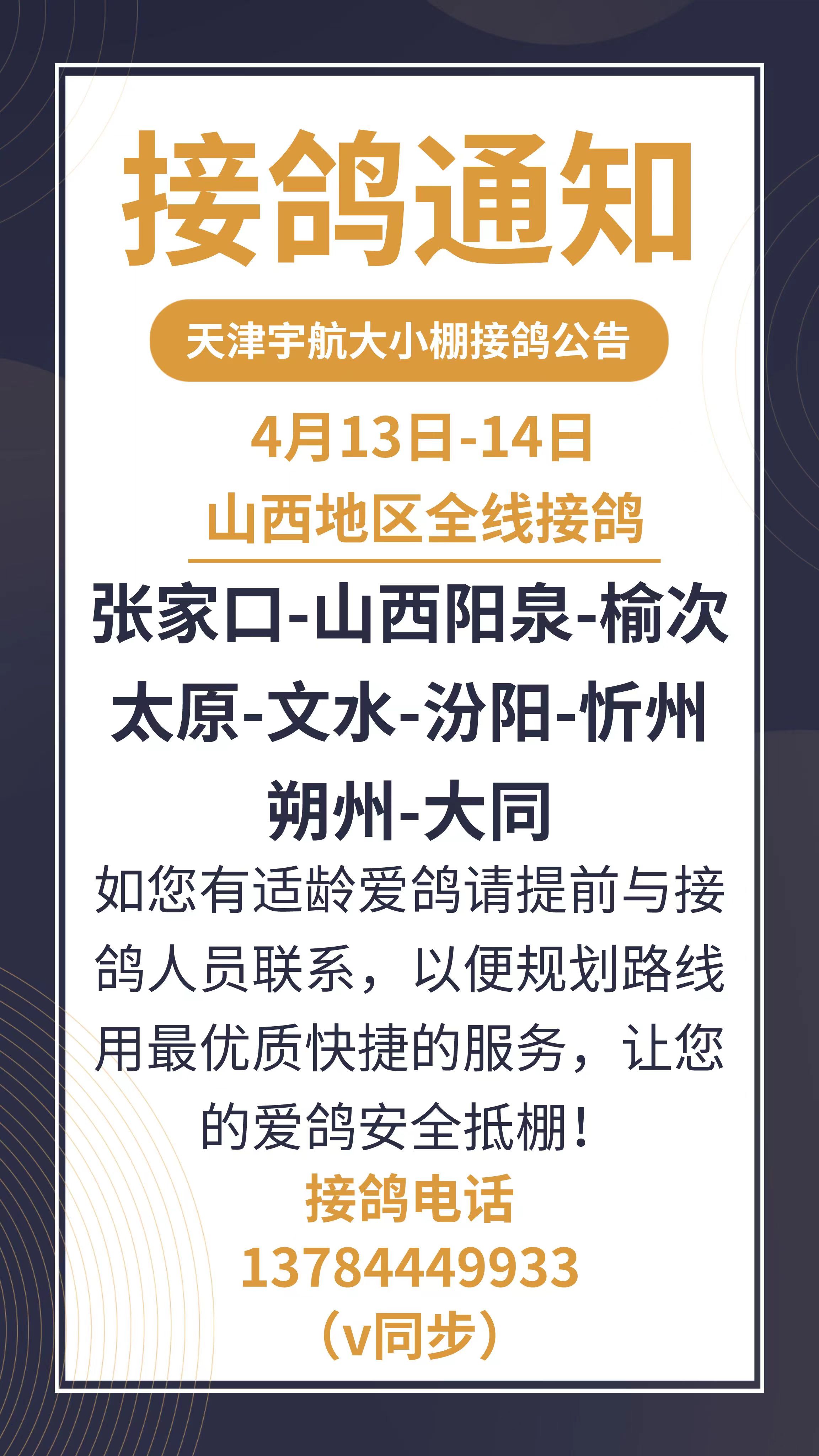 天津宇航赛鸽公棚4月13日-14日前往张家口、山西地区接鸽