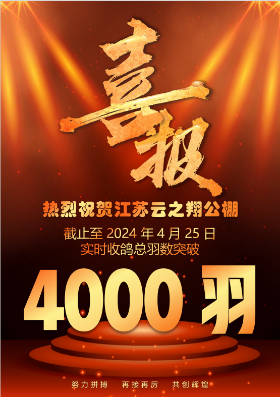江苏云之翔截至4月25日收鸽羽数突破4000羽