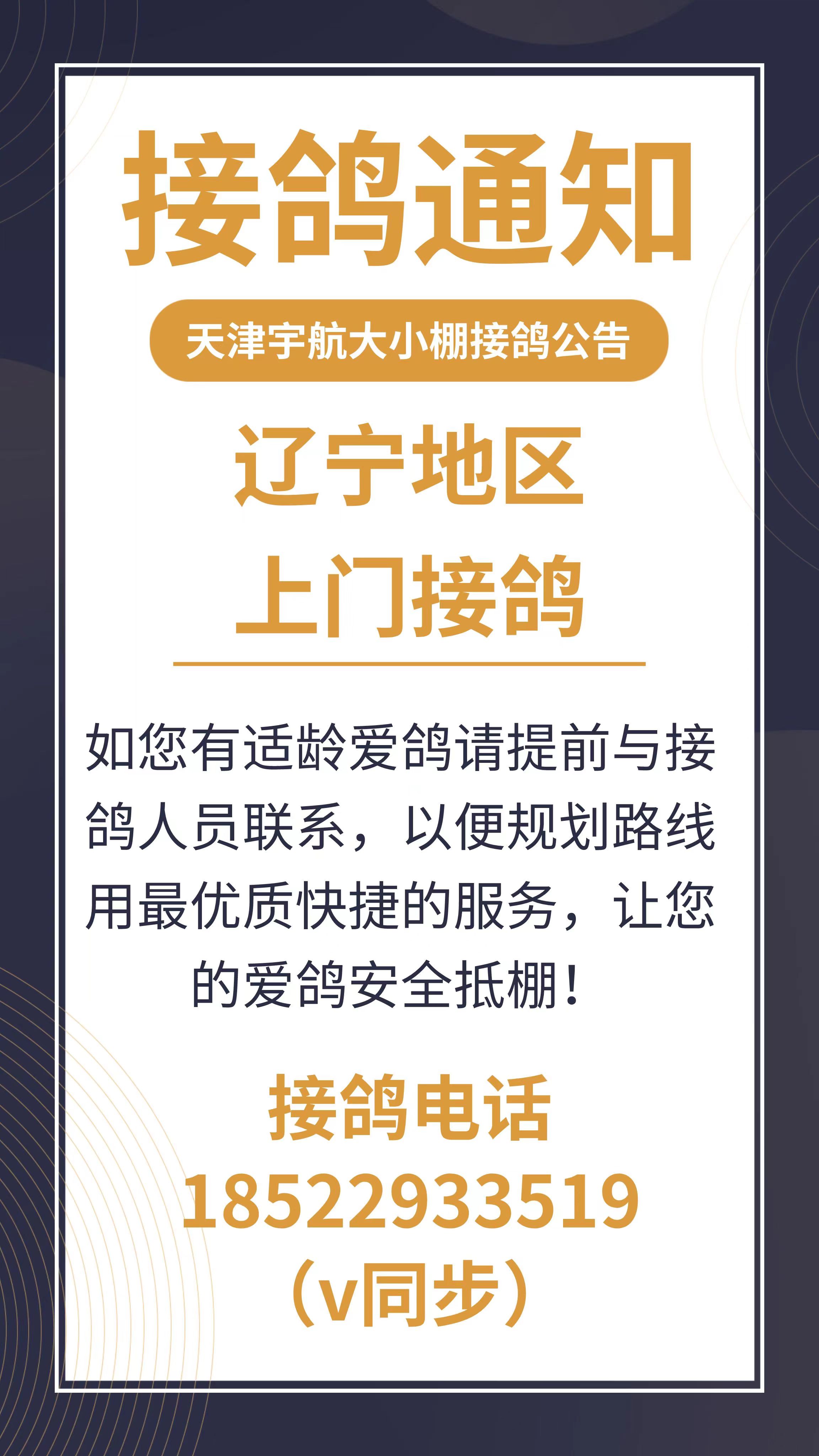 天津宇航赛鸽公棚4月28日前往辽宁地区上门接鸽