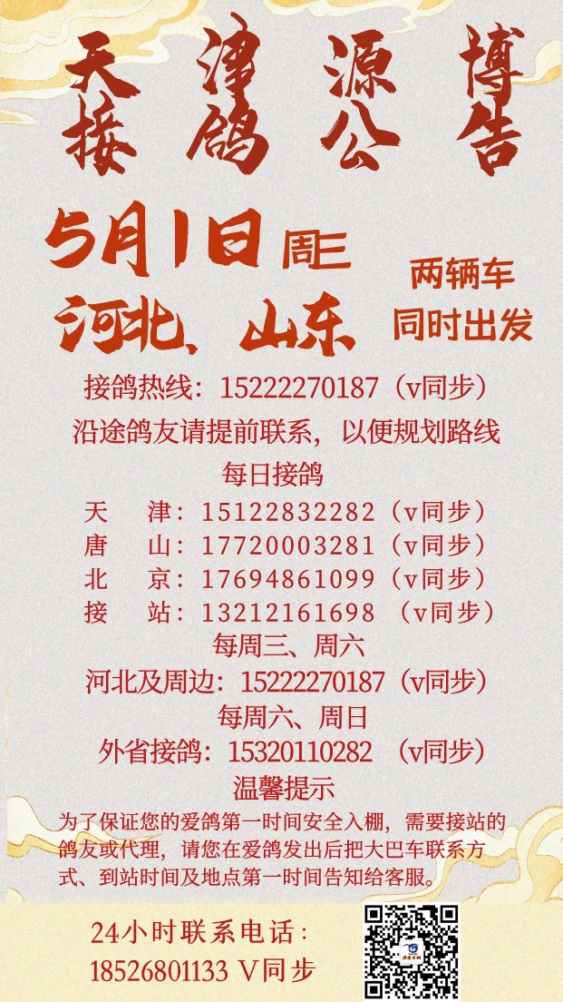 天津源博公棚接鸽公告5月1日前往河北、山东两辆车同时出发