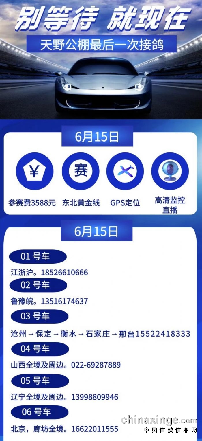 天津天野公棚6月15日接鸽指南(江浙沪,鲁豫皖,河北,山西,辽宁,北京)