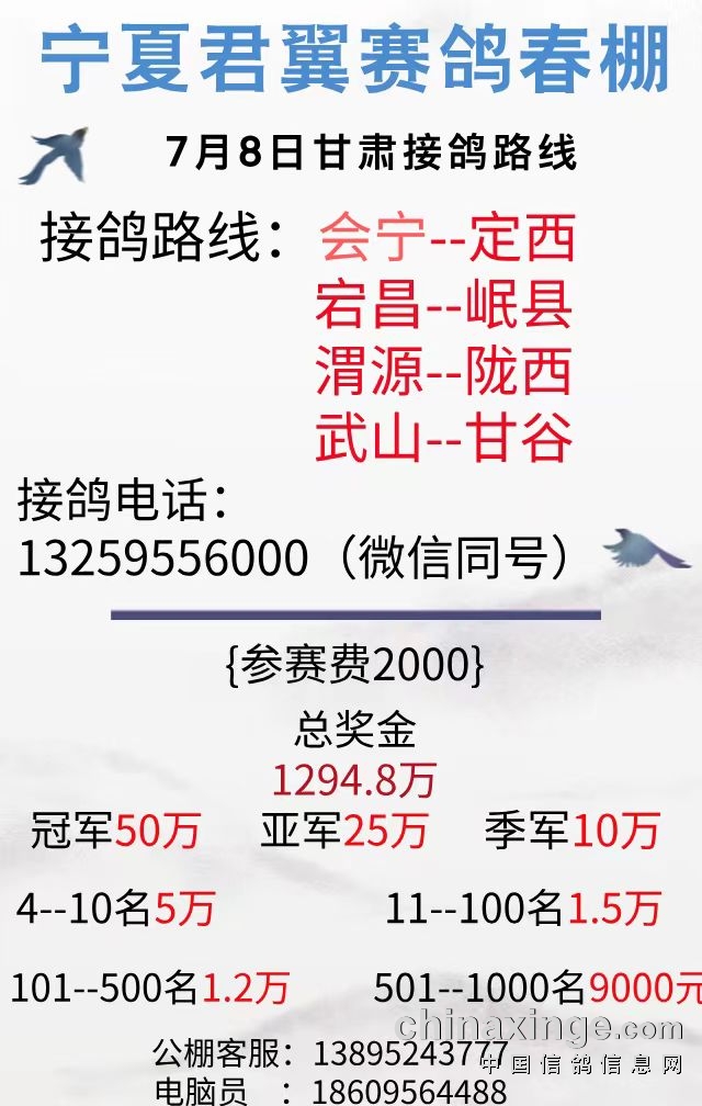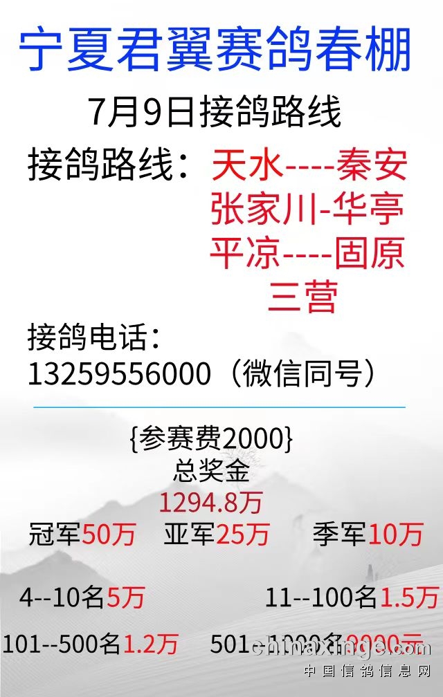 宁夏君翼赛鸽公棚(春棚)850公里比赛通知