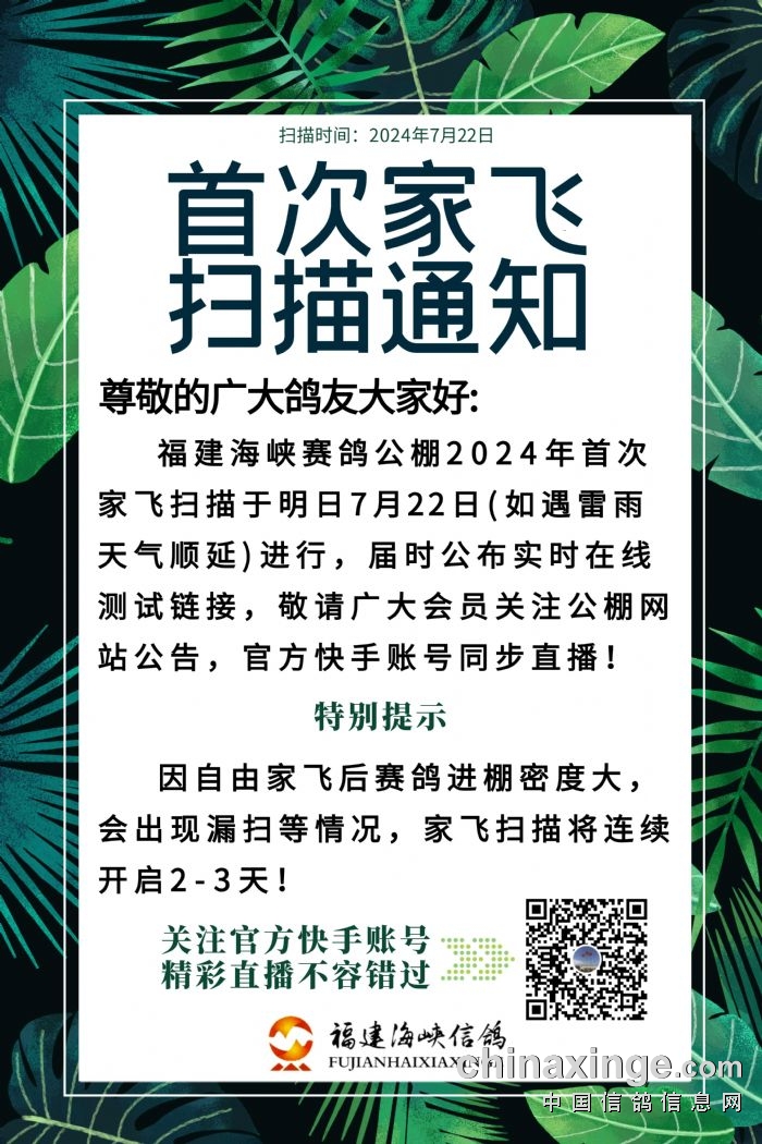 福建海峡赛鸽公棚2024年首次家飞扫描通知