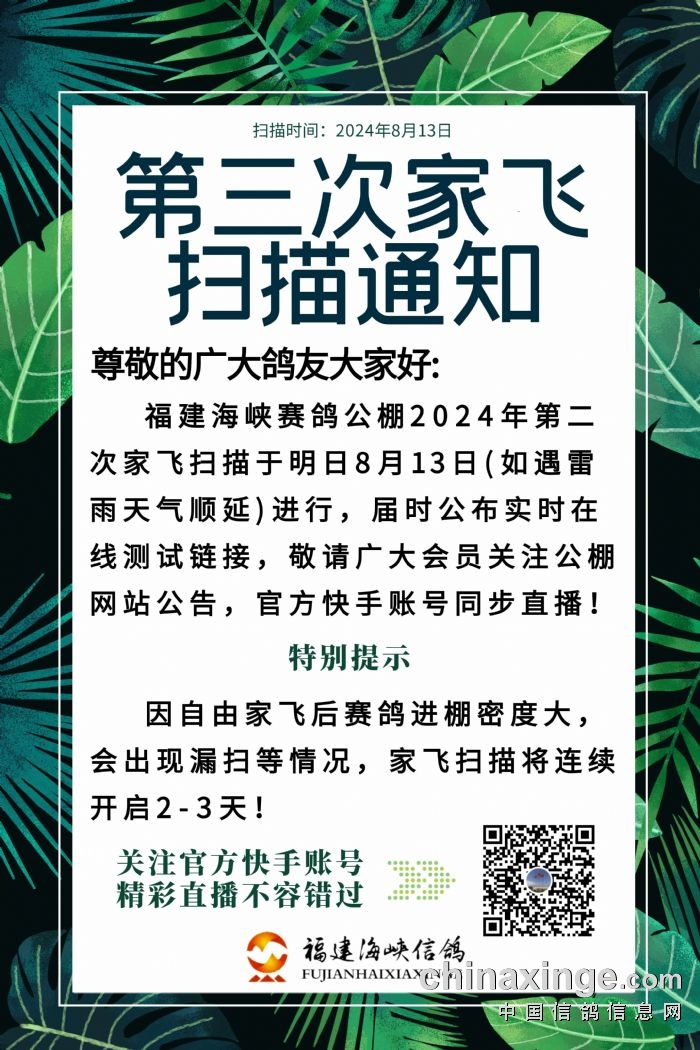 福建海峡赛鸽公棚2024年第三次家飞扫描通知
