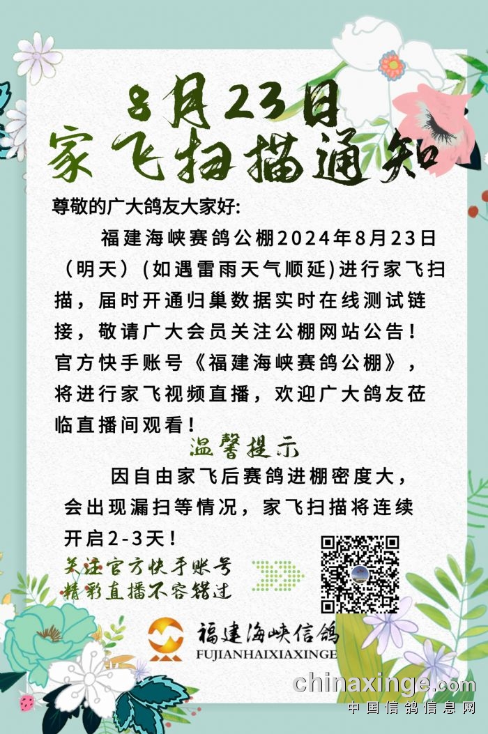 福建海峡赛鸽公棚8月23日家飞扫描通知