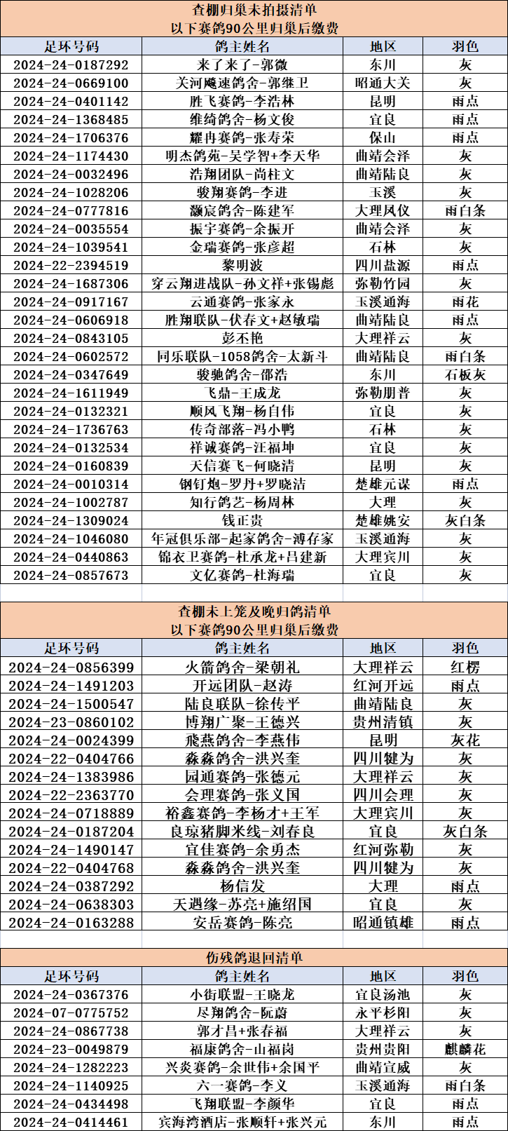 勝利飞翔公棚 2024年“漏拍鸽、受伤鸽、晚归鸽”清单