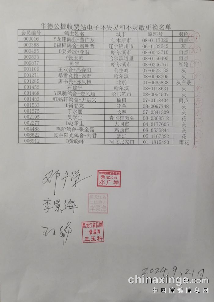 哈尔滨华德秋棚·决赛250名-101名获奖鸽性别参考
