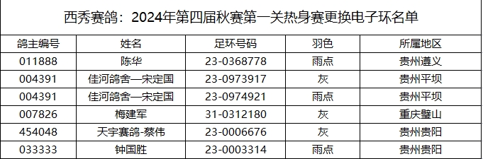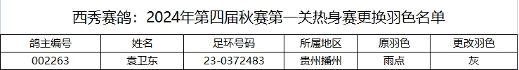 西秀赛鸽:2024年第四届秋赛第一关热身赛更换电子环及更换羽色名单