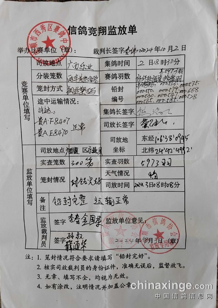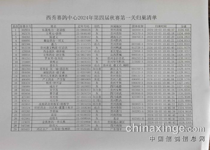 西秀赛鸽:2024年秋赛第一关热身赛前100名获奖名单