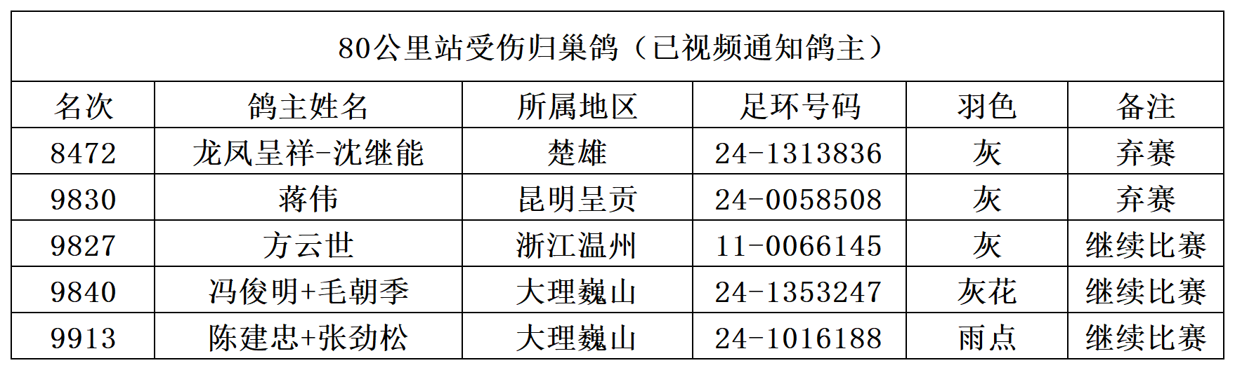 2024达人赛鸽中心:80公里受伤归巢鸽公示