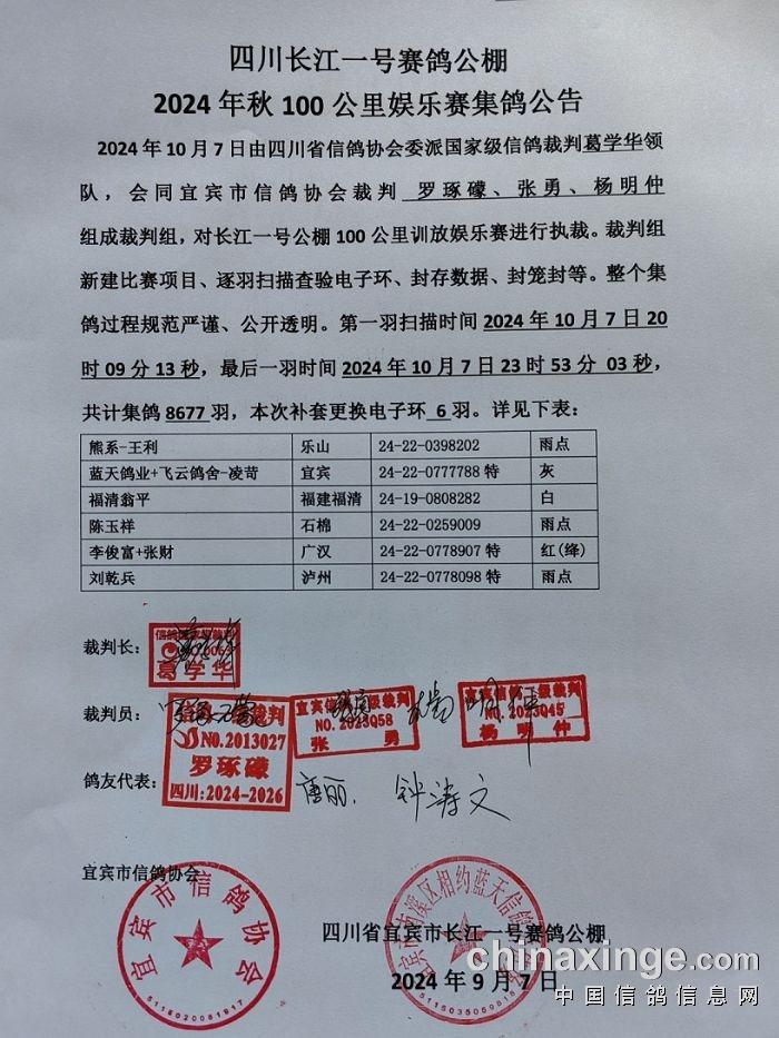 四川长江一号公棚(秋)决赛集鸽数据(按顺序排序)