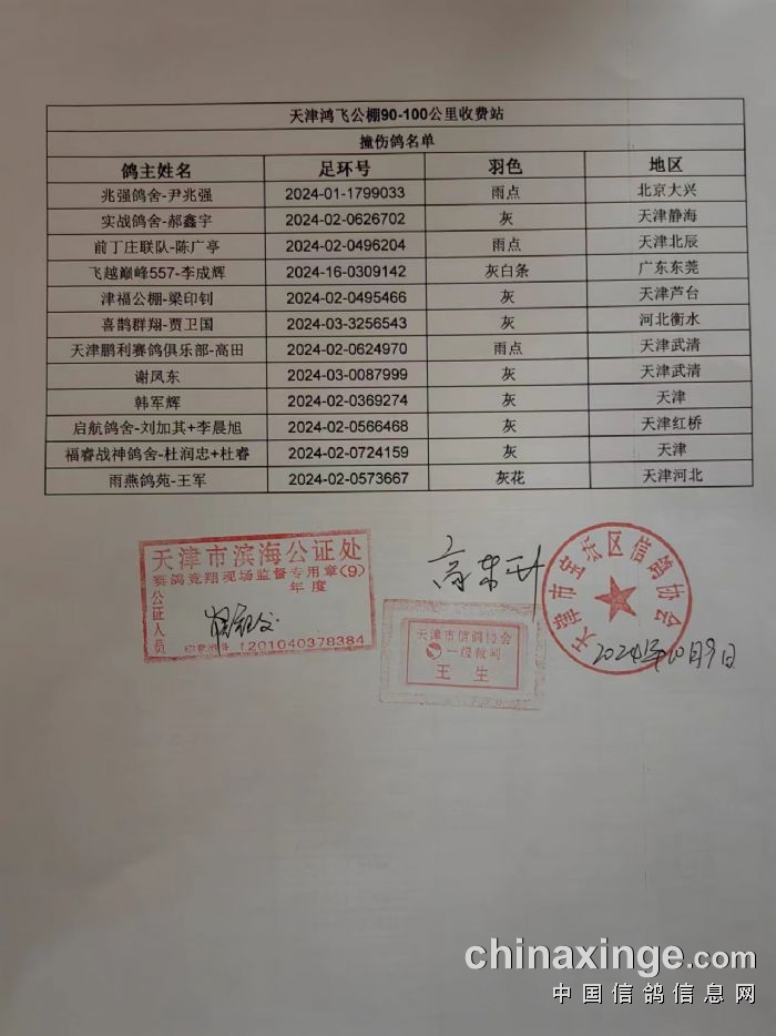 天津鸿飞公棚90-100公里收费站撞伤鸽名单