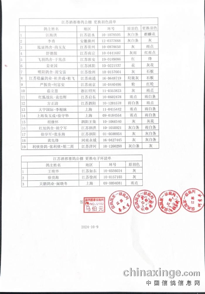 酒都赛鸽公棚100公里集鸽更改羽色及电子环清单
