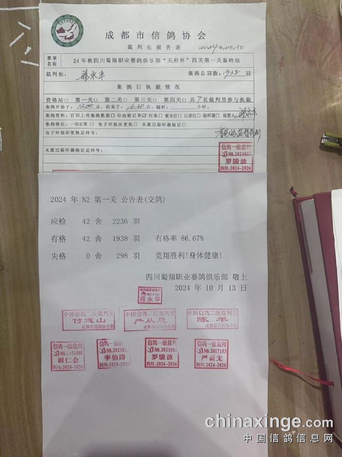四川蜀翔职业赛鸽俱乐部2024年秋季“天府杯”职业赛首关秦岭站集鸽工作在省鸽协委派裁判和成都市信鸽协会执裁裁判的认真执裁下,经全体参赛团队(鸽友)积极参与和支持,已于2024年10月13日16点30圆满结束。总集鸽羽数1938羽。现将集鸽执裁报告及相关数据公示如下(所有集鸽原始单据、存根由执裁裁判保管,待比赛结束验鸽时开启核对):