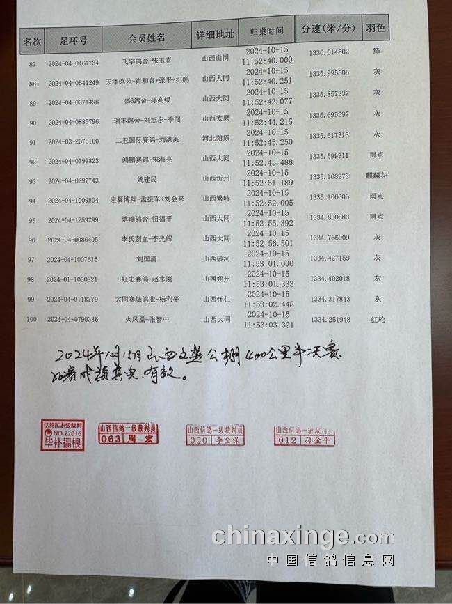 山西文盛赛鸽公棚嘉奖获奖名单