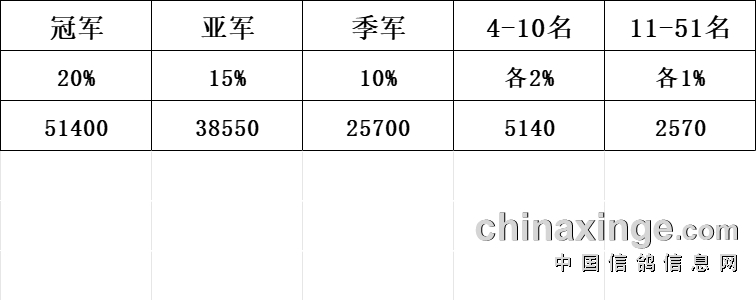 精英赛报名赛鸽共计514羽,每羽参赛费500,共计奖金257000,按实际收费羽数重新分配奖金如下(决赛中产生):