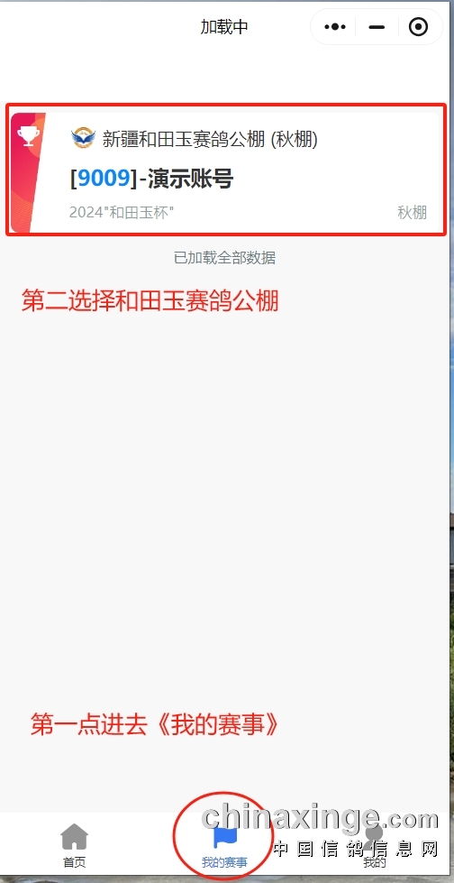 第一微信搜索(掌上公棚)小程序然后点击《我的赛事》选择新疆和田玉赛鸽公棚点击进入