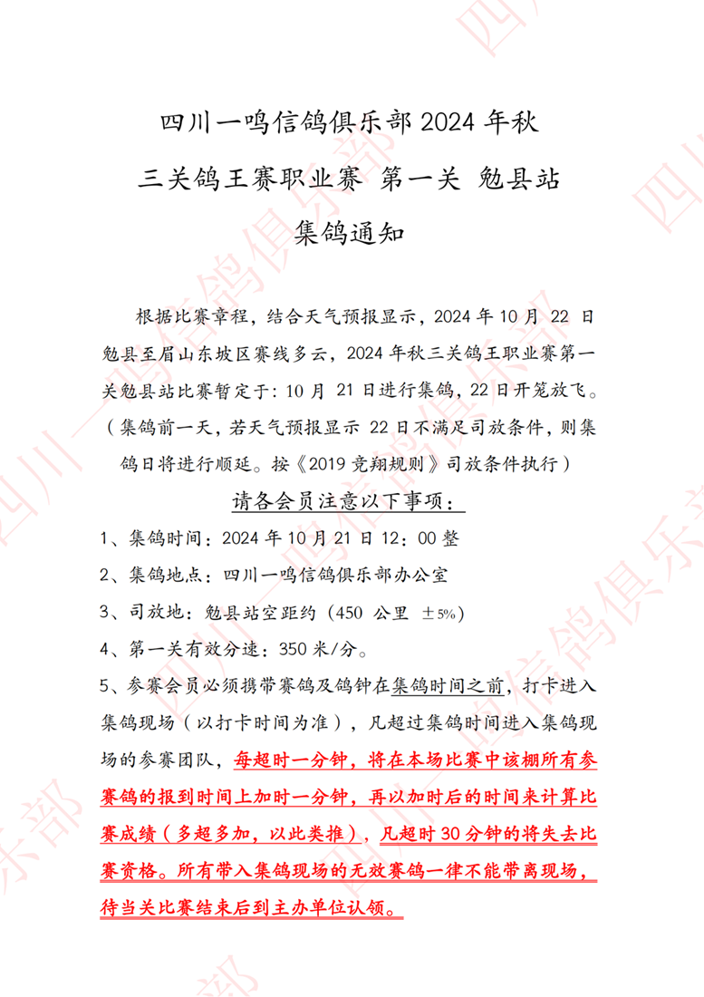 四川一鸣信鸽俱乐部第一关勉县站集鸽公告