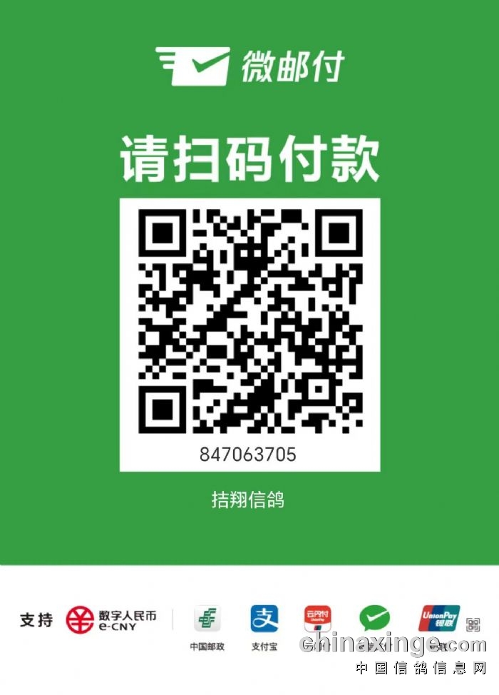 指定交费渠道与交参赛费一致;如是向银行转帐汇款的鸽友,请将参赛者(鸽主)姓名、交费内容填写清楚,与银行转款记录一起用微信发至: