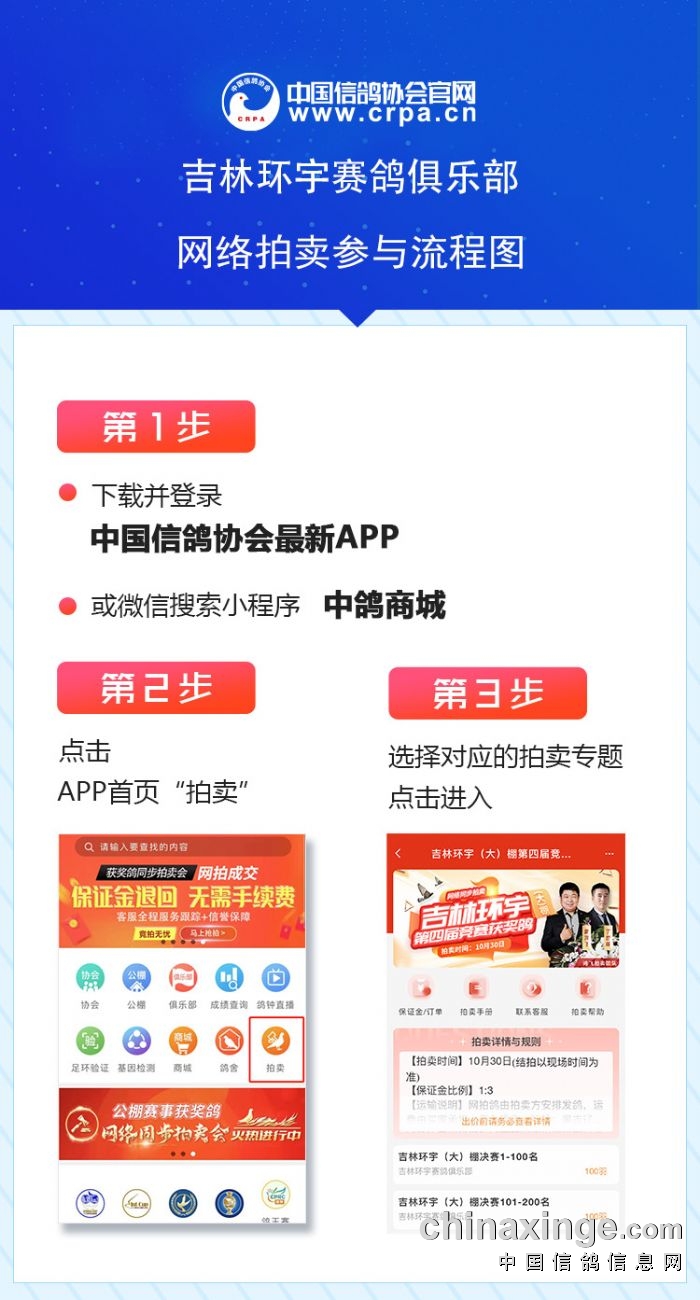 竞拍者可登录中.鸽.协.官.网或下载中.国.信.鸽.协.会APP注册会员,然后充值自己所需比例预存保证金,保证金比例为一比三,参加竞拍。