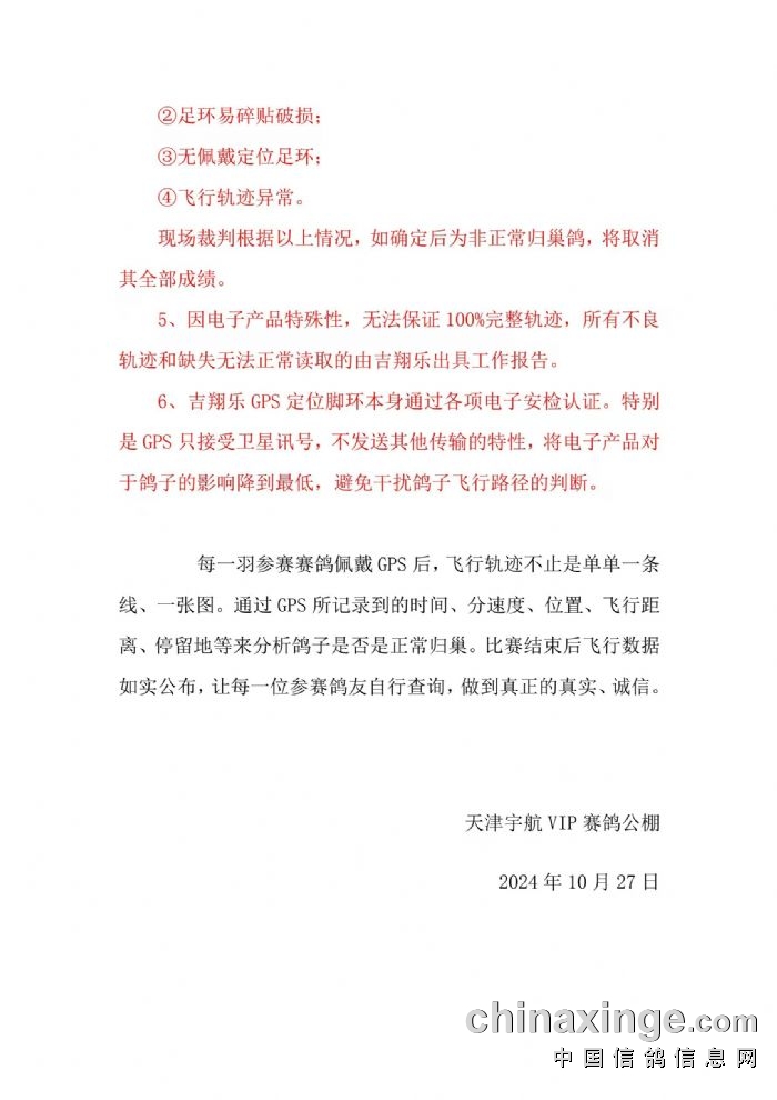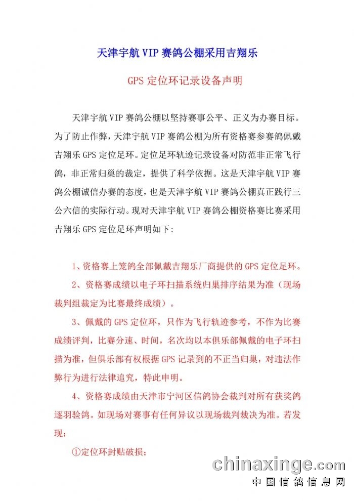 天津宇航VIP赛鸽公棚采用吉翔乐GPS定位环记录设备声明